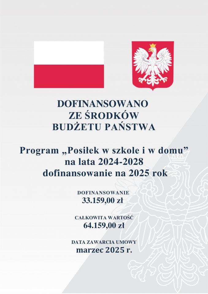 W 2025 r. wysokość dofinansowania ze środków budżetu państwa wynosi 33.159,00 zł, środki własne na realizację programu „Posiłek w szkole i w domu” ujęte w budżecie Gminy Karczew to 31.000,00 zł.